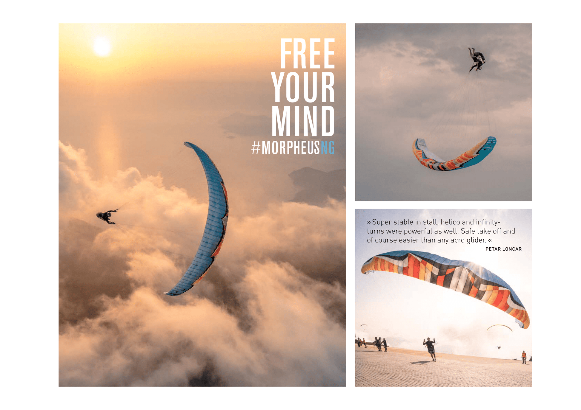 "The MORPHEUS Next Generation is the world‘s first infinity tumble capable certified paraglider. It pays homage to the Acro History of U-Turn with the insights of the next generation of development. The Acro-Trainer and Freestyler offers easily accessible dynamics. He is equipped with a significantly higher performance profile than the purebred Acro wing. The MORPHEUS carries the unmistakable DNA of its big dynamic brothers Blackout + and Joker, but acts much softer. The Morpheus is the perfect starting wing to later change to the related wings. Especially acro beginners appreciate the sweet-tempered characteristics when the timing is not on point with the good feeling of a certified wing."