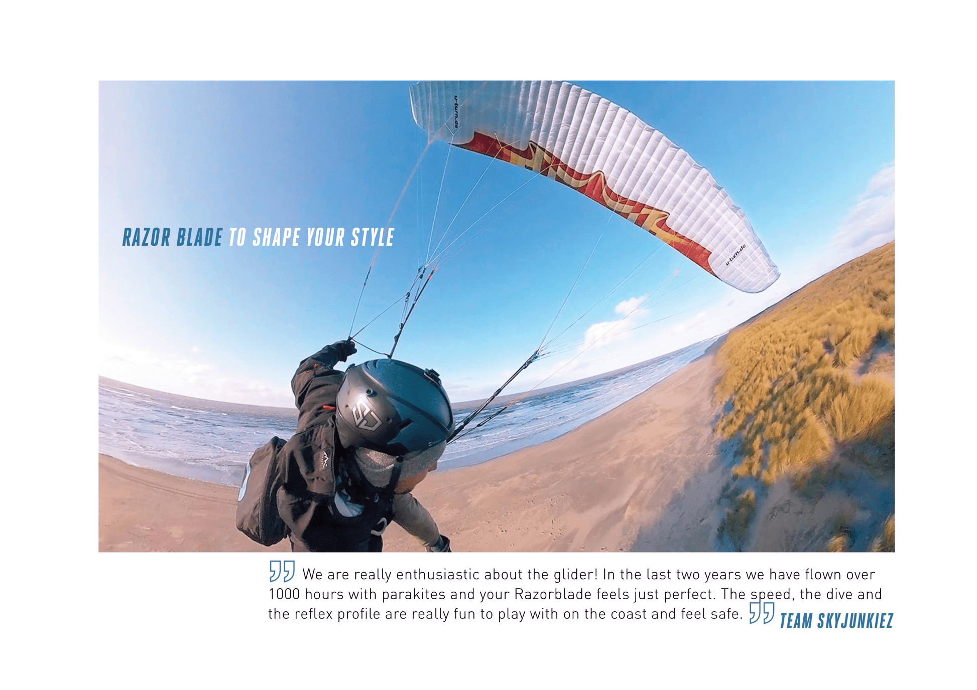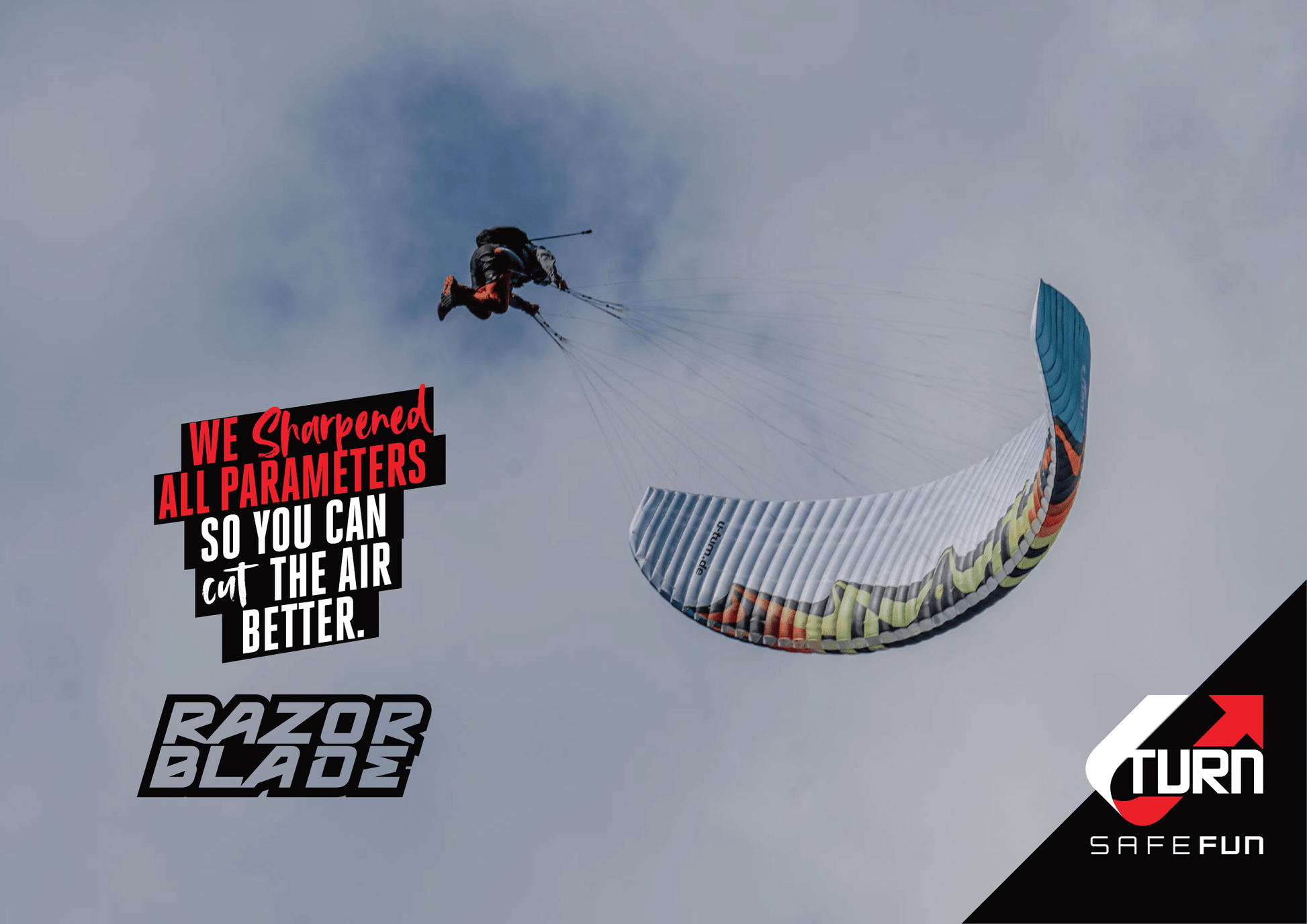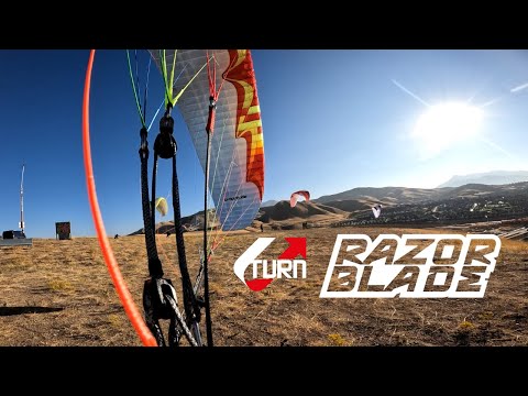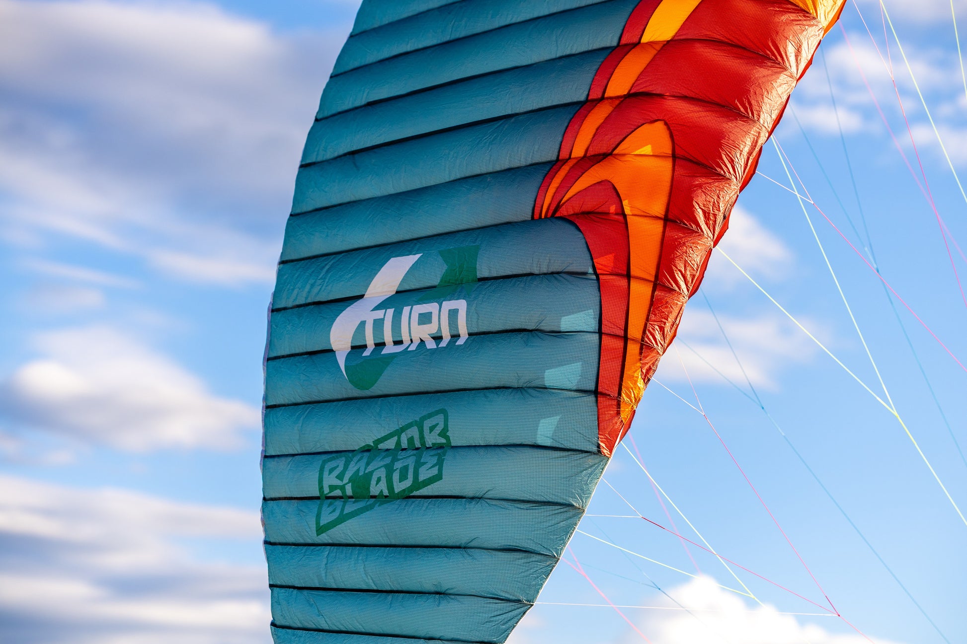 The Uturn Razorblade is a flare moustache like parakite where brake hands up equal full speedbar and brake hands down is a smooth fun and effecient rocketship of a ride!🚀