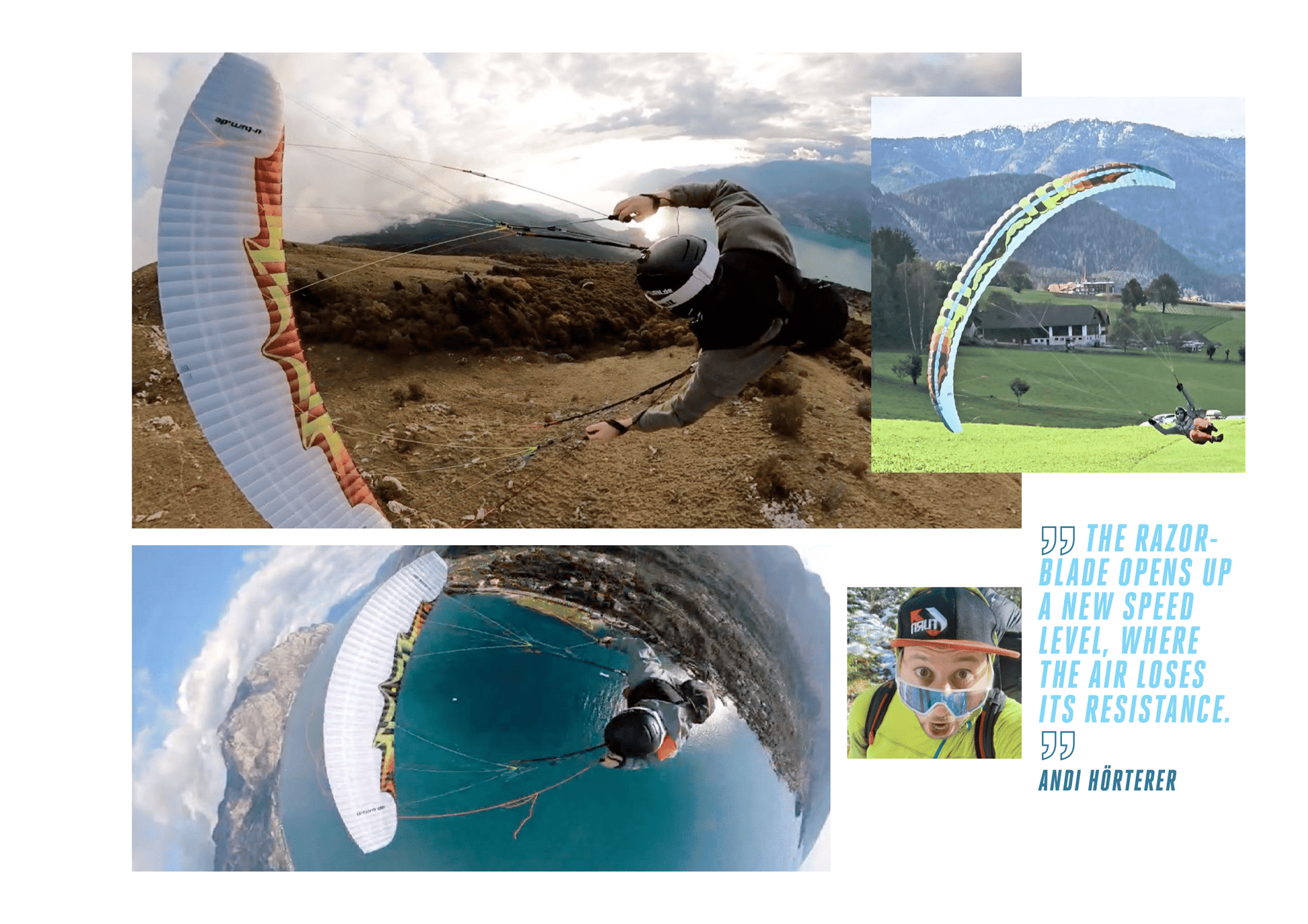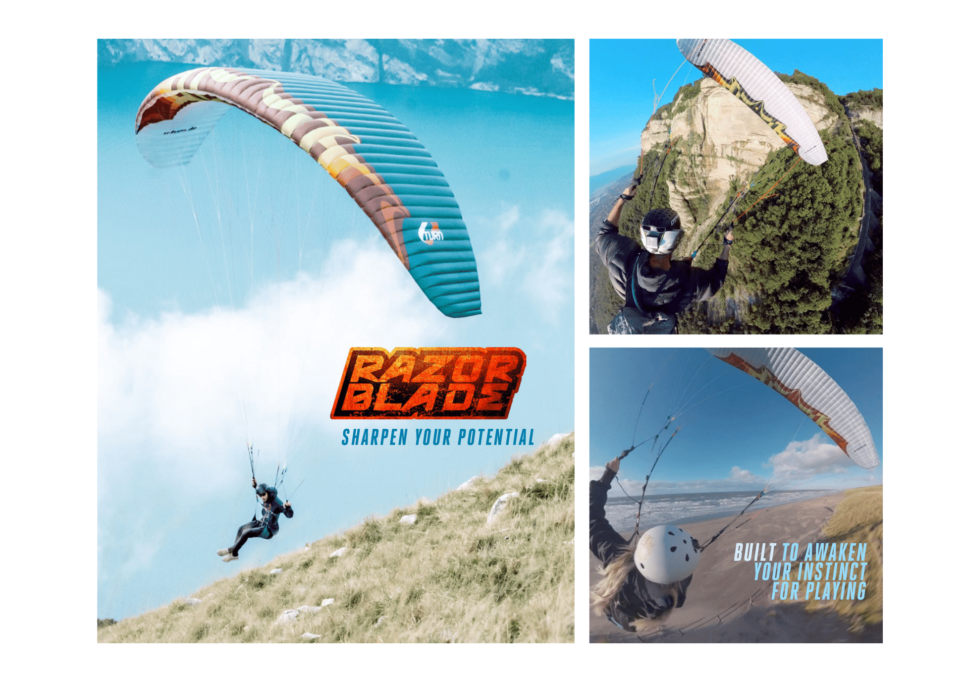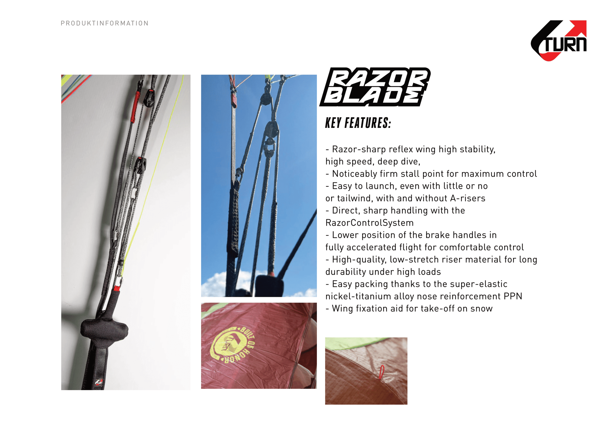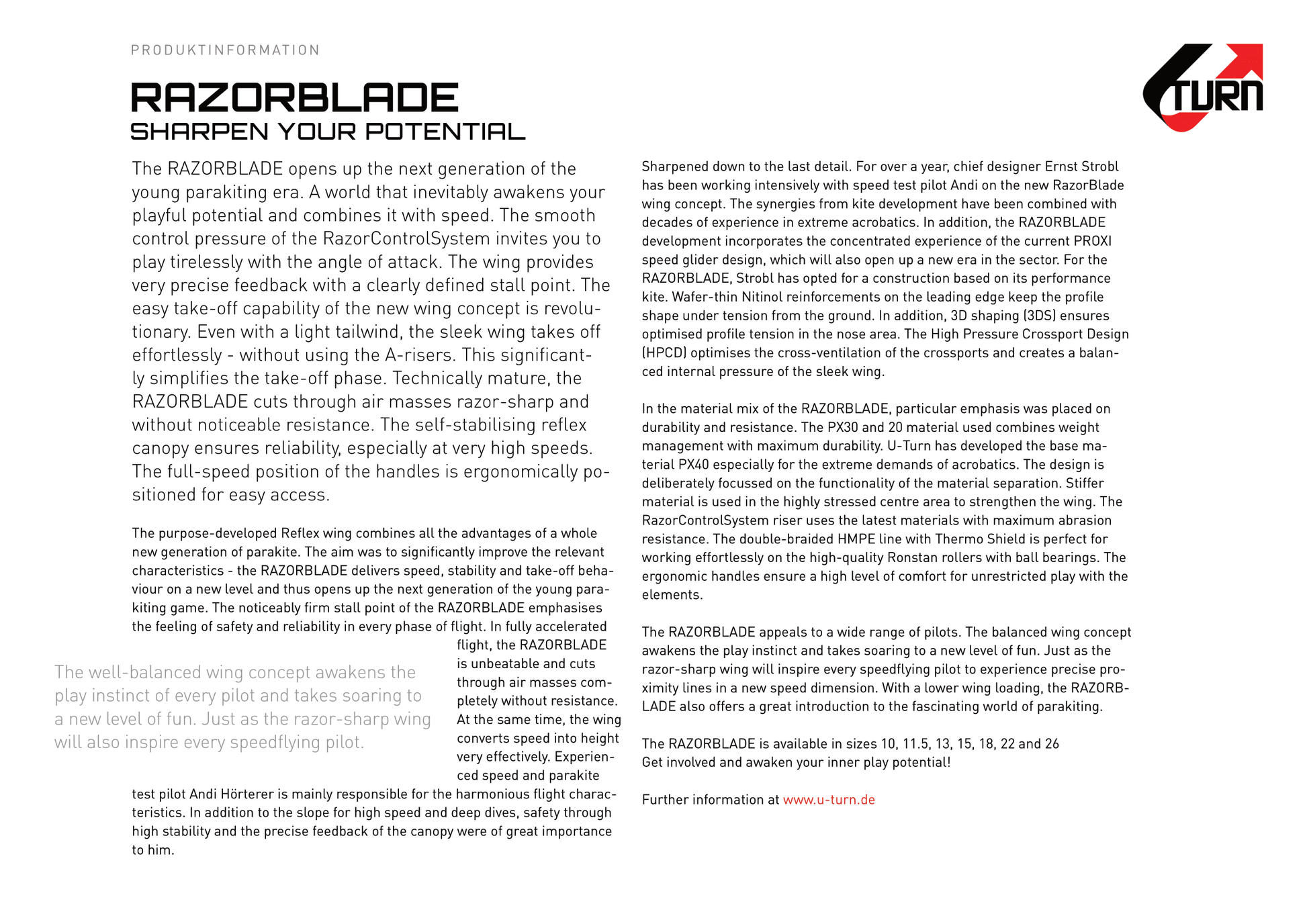 The Uturn Razorblade is a flare moustache like parakite where brake hands up equal full speedbar and brake hands down is a smooth fun and effecient rocketship of a ride!🚀